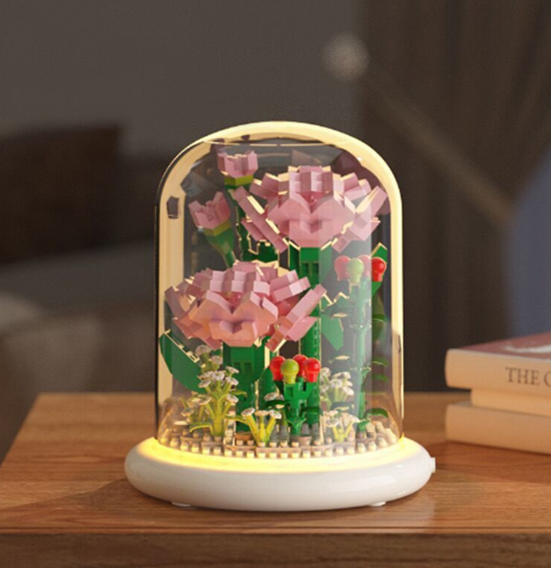 Дитячий блоковий конструктор квіти Гвоздика на 770 деталей в колбі на підставці з підсвіткою